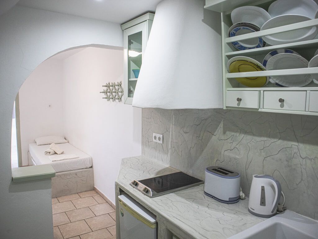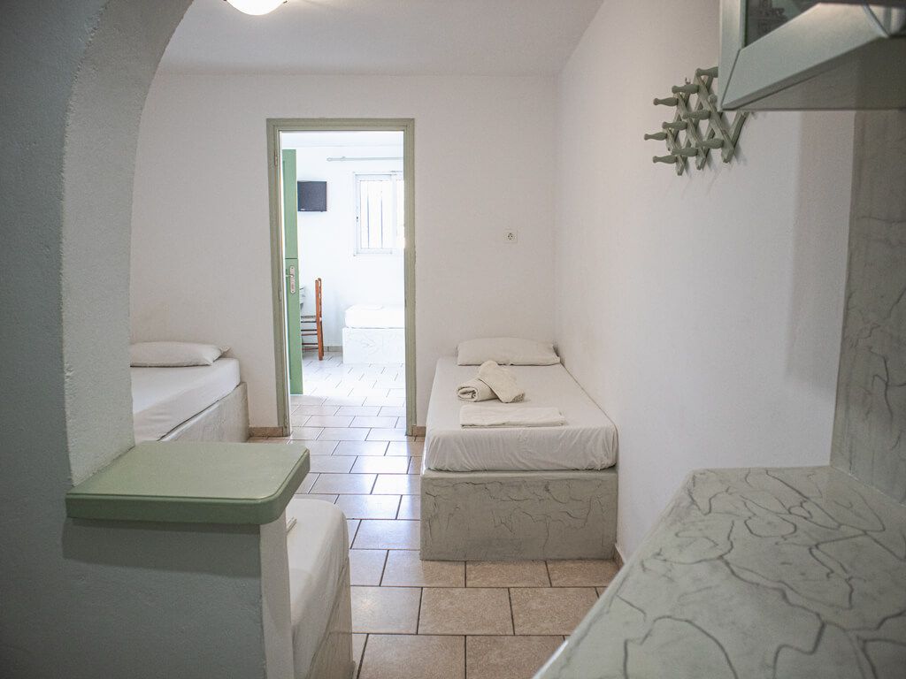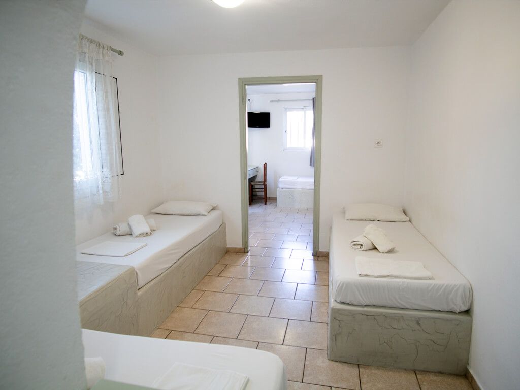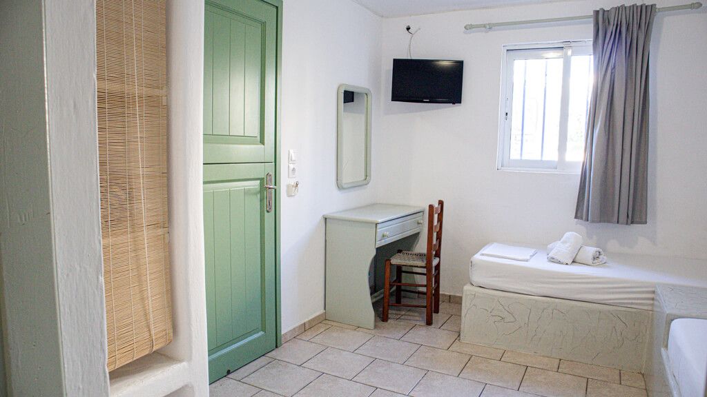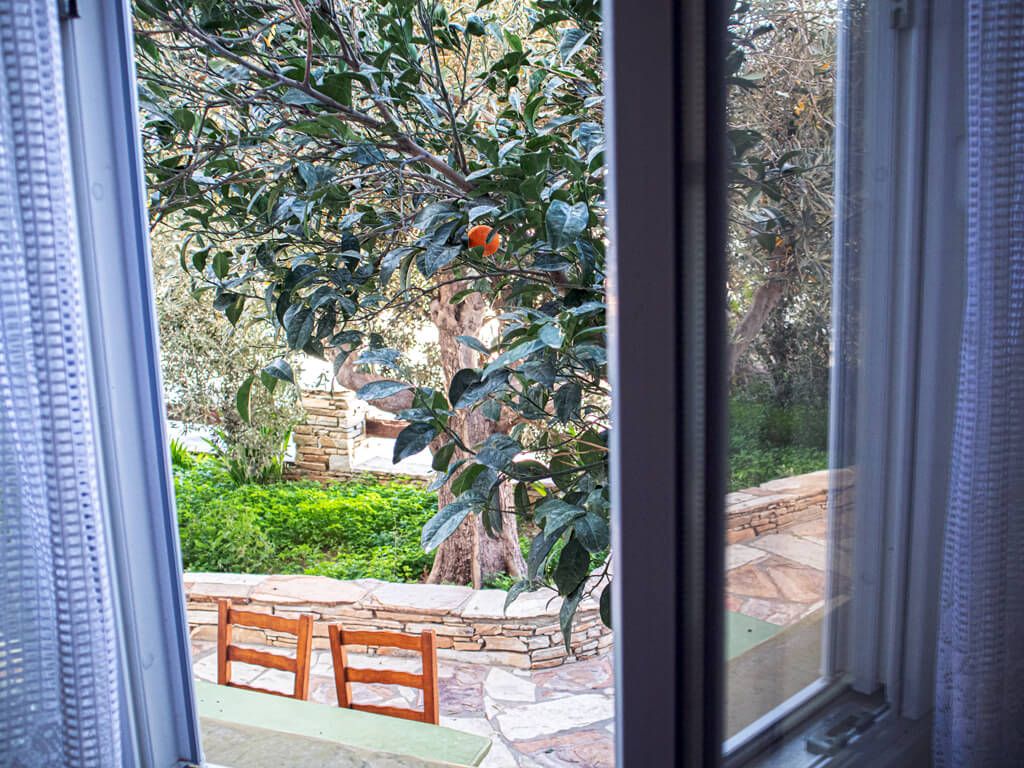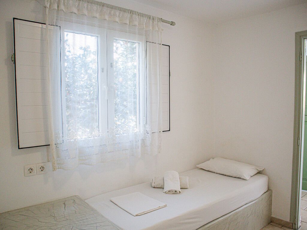 This traditional quadruple studio has 2 separate rooms with single beds that can accommodate up to 5 people. It is fully equipped with Air conditioning, kitchenette, fridge, tv and has access to our beautiful garden. The windows overlook the trees and the terrace of the studio. Ideal for friends and families.